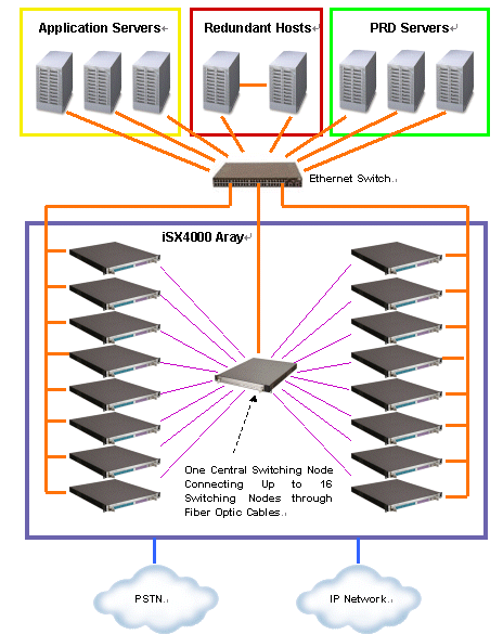 下圖顯示了一個大容量iSX4000 UAP系統(tǒng),該系統(tǒng)由兩臺互為冗余備份的主機、三臺應(yīng)用服務(wù)器、三臺PRD服務(wù)器和一個由16臺iSX4000交換機和一臺中央交換節(jié)點構(gòu)成的iSX4000陣列構(gòu)成。交換陣列的16臺iSX4000交換機通過光纖和中央交換節(jié)點連接。中央交換節(jié)點提供系統(tǒng)跨節(jié)點交換能力。系統(tǒng)可同時提供最多31744