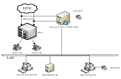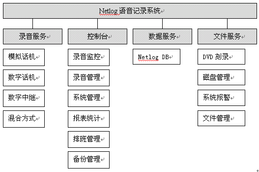NetLog語音記錄系統(tǒng)采用基于分布式、多層控制管理體系的設(shè)計(jì)思想,將電話線路與內(nèi)部網(wǎng)絡(luò)有效地結(jié)合在一起,形成一套完整的語音記錄、管理系統(tǒng)。NetLog系統(tǒng)包括數(shù)據(jù)服務(wù)、文件服務(wù)、記錄服務(wù)、控制臺;