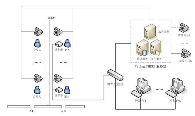 NetLog PMTMS會客室電話管理系統(tǒng)采用基于分布式、多層控制管理體系的設計思想,將電話線路與內部網(wǎng)絡有效地結合在一起,形成一套完整管理系統(tǒng),包括會見監(jiān)控、通話錄音、數(shù)據(jù)管理。