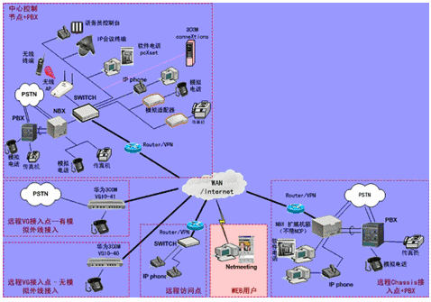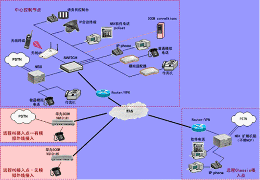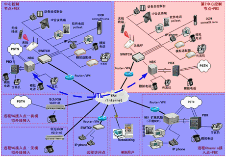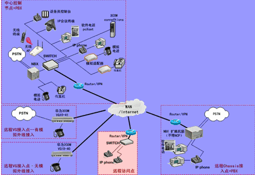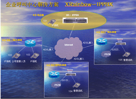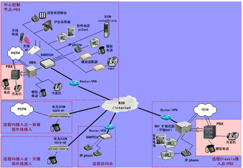 IPPBX將成為企業(yè)辦公不可缺少的一部分。此方案適合于已經(jīng)有PBX的公司,由于先期已經(jīng)投入了PBX設(shè)備,費(fèi)用昂貴,所以不會(huì)輕易被替換。在外地有多家分公司,使用傳統(tǒng)電話通訊費(fèi)用很高,希望能降低成本。并希望在分公司所在城市可以通過當(dāng)?shù)氐腜STN落地,節(jié)省長途費(fèi)用。依照客戶的需求,我們制定了以下方案: