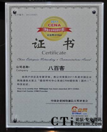 CTI論壇(ctiforum)10月31日消息(記者 張潔):10月19日,2011 秋季CENCE 中國(guó)企業(yè)網(wǎng)絡(luò)通信大會(huì)暨云計(jì)算高峰論壇在上海展覽中心盛大舉行。國(guó)內(nèi)首家SaaS廠商八百客憑借連續(xù)在云計(jì)算領(lǐng)域的成熟技術(shù)以及在市場(chǎng)中的廣泛認(rèn)可度,獲得“最佳呼叫中心系統(tǒng)CRM提供商”大獎(jiǎng)。