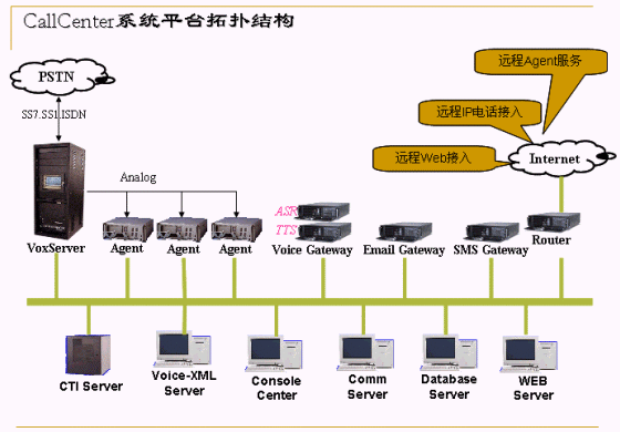 采用了Solaris,Linux,Windows 2000操作系統(tǒng)、IIS Web服務器、大型數(shù)據(jù)庫系統(tǒng)Sybase,運用了Internet、Intranet、TTS、ASR、TTF技術,并采用B/S系統(tǒng)結構。電話語音處理采用了國際流行的硬件設備。系統(tǒng)平臺化設計,系統(tǒng)功能與業(yè)務功能互不影響,支持0-2048座席的平滑配置。