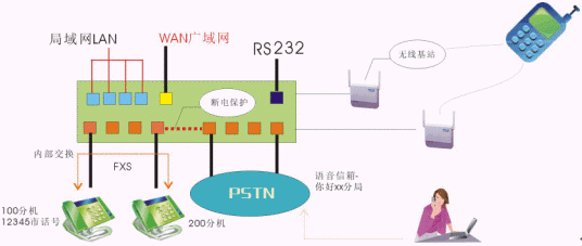 - 同時接入PSTN和專網(wǎng)電話,并在網(wǎng)關上實現(xiàn)內部交換、語音信箱、和PSTN交換等功能
