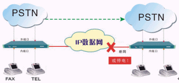 IP數(shù)據(jù)網(wǎng)故障或設備斷電時,呼叫可自動跳轉到PSTN市話網(wǎng),同時播放語音告警。