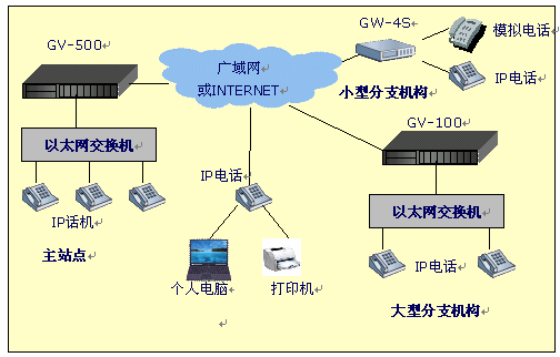 - 分公司:選用一臺(tái)4口網(wǎng)關(guān)設(shè)備,接入到互聯(lián)網(wǎng)絡(luò),通過(guò)公共的IP交換中心建立起呼叫連接,實(shí)現(xiàn)打電話(huà)的功能。模擬了通過(guò)網(wǎng)關(guān)設(shè)備接入PBX(電話(huà)程控交換機(jī)),如果其它分部也要接入PBX,與此情況類(lèi)似。(詳見(jiàn)后面的"撥號(hào)示例")