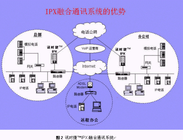 將訊時捷?IPX放在公司總部,其它分支機構(gòu)可以通過IP話機,軟電話或者網(wǎng)關(guān)設備登錄到總部的IPX上,這樣就形成了整個公司的VOIP網(wǎng),建立了企業(yè)自己的通訊平臺。