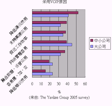 根據(jù)美國著名的咨詢公司 The Yankee Group 2005 年的調(diào)研各企業(yè)使用VOIP的原因,大企業(yè)與中小企業(yè)略有差異:大企業(yè)認為網(wǎng)絡管理、省錢、促進工作效率為最關(guān)鍵的三個原因;中小企業(yè)則認為省錢、網(wǎng)絡管理容易、支持高速應用、促進工作效率為主要原因。