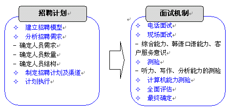 東軟呼叫中心充分挖掘東北地區(qū)豐富的韓語人才資源,通過多種招聘渠道滿足項目的人才需求。東軟自身的教育機構(gòu)--東軟信息學(xué)院也可以培養(yǎng)專業(yè)的韓語人才,另外,東軟信息學(xué)院與韓國某大學(xué)進行戰(zhàn)略合作,通過為韓國留學(xué)生提供呼叫中心實習(xí)機會及漢語培訓(xùn)等,方式,吸引數(shù)名高素質(zhì)韓國大學(xué)生加入呼叫中心,充分滿足該項目對專業(yè)人才的需求。