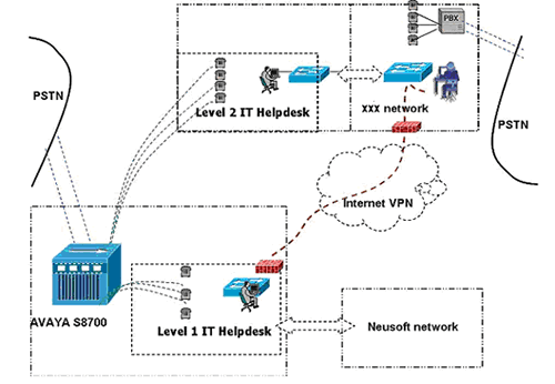 實施中,A公司的IT Helpdesk服務熱線號碼直接路由至東軟呼叫中心平臺,Level 1座席用東軟呼叫中心的分機提供在線服務;Level