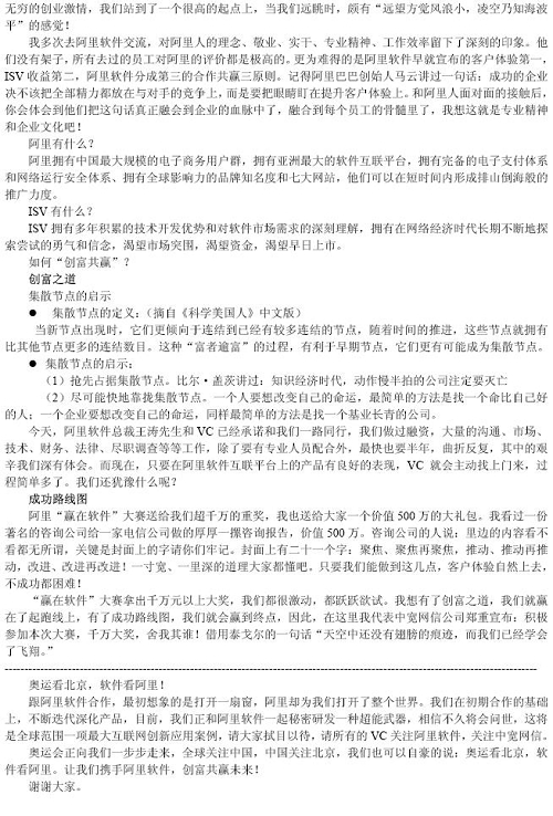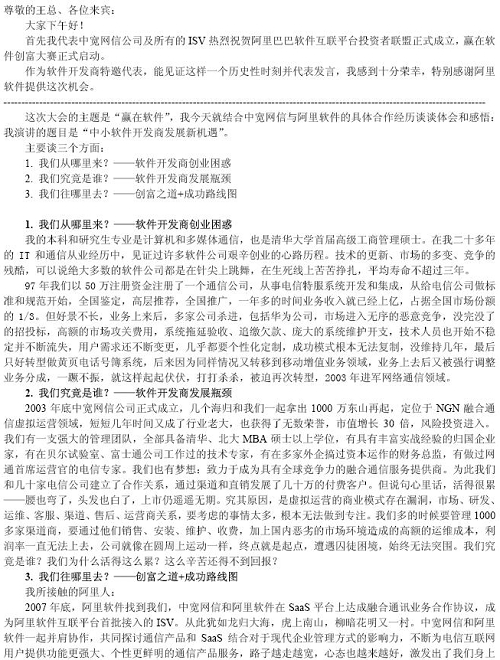 余輝先生在大會上表示,對于整個互聯(lián)網(wǎng)、軟件產(chǎn)業(yè)鏈條來說,在線軟件(SaaS)不但是最熱門的話題,更是順應市場需要的新技術(shù)趨勢,中寬網(wǎng)信將和阿里軟件一起,在打造全球“軟件沃爾瑪超市”的過程中發(fā)揮自己的技術(shù)應用研發(fā)強項,為全國2億互聯(lián)網(wǎng)網(wǎng)民提供更豐富便利、更低成本的軟件服務。余輝先生還和與會嘉賓分享了中寬網(wǎng)信和阿里軟件合作過程中的體會和感悟。