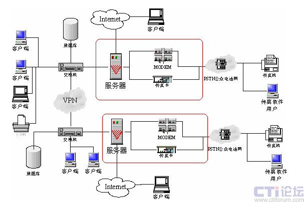 客戶在傳真上簽署確認(rèn)后回傳至遞四方的gotoneFax服務(wù)器上,并通過DTMF虛擬分機分發(fā)功能將傳真分發(fā)到指定業(yè)務(wù)員的收件箱中,業(yè)務(wù)員輸入歸檔信息后自動轉(zhuǎn)到合同部門進行電子歸檔。系統(tǒng)的拓?fù)浣Y(jié)構(gòu)如下:
