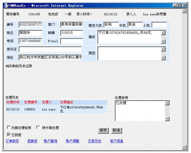 客戶向麥考林定購商品的最常用途徑就是電話訂貨,客戶撥打麥考林服務熱線進入客服系統(tǒng)。系統(tǒng)會根據(jù)客戶的主叫號碼對客戶進行識別,如果識別成功,座席代表屏幕上會自動彈出客戶資料和以往訂貨記錄;如果識別失敗,座席代表可以根據(jù)客戶通報的客戶代碼或姓名等信息查詢客戶資料。如果是新客戶,座席代表可以立即為他創(chuàng)建客戶檔案。