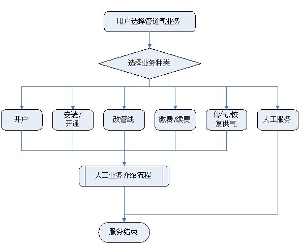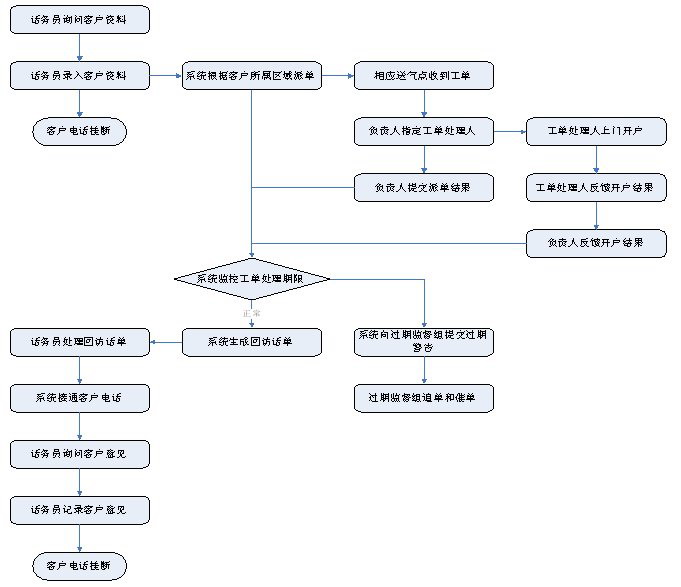 1)業(yè)務(wù)咨詢:用戶通過人工、自動語音等方式咨詢有關(guān)政策法規(guī)、資費標(biāo)準、用氣常識、報裝方法等,系統(tǒng)以語音、傳真、Email、短消息等方式回復(fù)客戶。