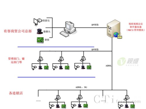 有容商貿(mào)大規(guī)模網(wǎng)絡(luò)遠(yuǎn)程會議和培訓(xùn)系統(tǒng)由服務(wù)器端和客戶端組成,服務(wù)器端軟件部署在公司中心機(jī)房,中心機(jī)房配置1臺單獨(dú)服務(wù)器,支持400個(gè)客戶端同時(shí)在線,負(fù)責(zé)所有會議和培訓(xùn)的召集、音視頻交互、加密等工作,有容商貿(mào)各部門、轄下各連鎖店通過WEB方式(包括ADSL、3G無線等多種網(wǎng)絡(luò))即可實(shí)現(xiàn)客戶端軟件的自動(dòng)安裝與升級,配備簡單的攝像頭和話筒之后就可以實(shí)現(xiàn)有容商貿(mào)以及連鎖店的大規(guī)模工作會議和高清音視頻網(wǎng)絡(luò)培訓(xùn)。網(wǎng)絡(luò)拓?fù)鋱D如下: