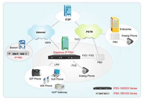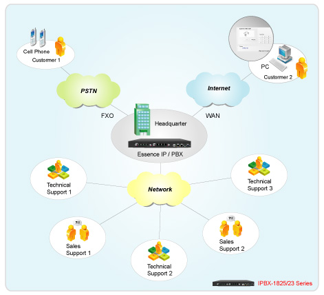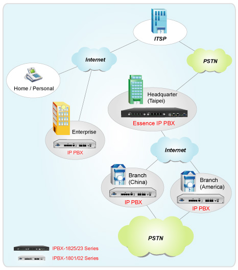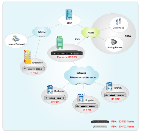 Essence IPBX系列可以注冊(cè)者之形式注冊(cè)于其他SIP協(xié)定伺服器上,如ITSP運(yùn)營(yíng)平臺(tái),或是分公司之小型IP PBX注冊(cè)至總公司之大型IP PBX ,均可透過(guò)Internet 將話務(wù)無(wú)限延伸。