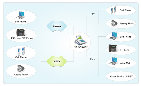 Essence IP-PBX的所有用戶均可透過(guò)內(nèi)部撥號(hào)方式之設(shè)定( Dialing Plan)將話務(wù)在不改變撥號(hào)習(xí)慣之前提下,經(jīng)由Internet導(dǎo)向外部ITSP服務(wù)商,再連接PSTN電話。