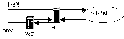1. 在已經(jīng)存在PBX電話交換機的情況下,這需要對PBX電話交換機進行定制,當用戶撥打市話時,直接由PBX與市話連接;當內(nèi)線用戶打長途電話時,可以根據(jù)交換機定制的被叫號碼,把話路轉(zhuǎn)到VoIP網(wǎng)關(guān)轉(zhuǎn)換成IP電話呼出。如圖所示: