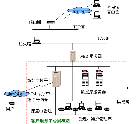 數(shù)據(jù)通信局的客戶遍布全國各地,建立一個(gè)覆蓋全國的客戶服務(wù)網(wǎng)絡(luò)勢(shì)在必行,因此我公司為之構(gòu)建了數(shù)據(jù)通信局客戶服務(wù)系統(tǒng),全國各地的各個(gè)客服中心的數(shù)據(jù)可以通過專線連接,語音也可以通過VOIP用數(shù)字專線連接,以降低長話費(fèi)用。該系統(tǒng)的投入使用,不但滿足了數(shù)據(jù)局為全國各地客戶服務(wù)的需要,而且可以收集客戶信息,不但降低了辦公費(fèi)用,而且有利于擴(kuò)大市場(chǎng)分額。數(shù)據(jù)通信客戶服務(wù)中心的主要目的是解決對(duì)全國大客戶的業(yè)務(wù)咨詢與申辦、障礙申告、投訴與建議的集中管理以及處理控制,系統(tǒng)采用800號(hào)接入,以一個(gè)小型的交換設(shè)備為座席電話分配點(diǎn),客戶撥入的電話,經(jīng)小型交換設(shè)備分配到空閑的座席上。
