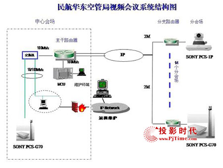 為了建成“具有華東特色,符合總局要求”的視頻會議系統(tǒng),空管局領(lǐng)導(dǎo)經(jīng)過嚴格的考察和甄選后,最后采用了Sony的視頻會議系統(tǒng)解決方案,包括5臺PCS-G70和10臺PCS-1P。整個項目運行在民航數(shù)據(jù)網(wǎng)(ATM網(wǎng))的環(huán)境下,共有24個節(jié)點,設(shè)備分布呈星型結(jié)構(gòu)。