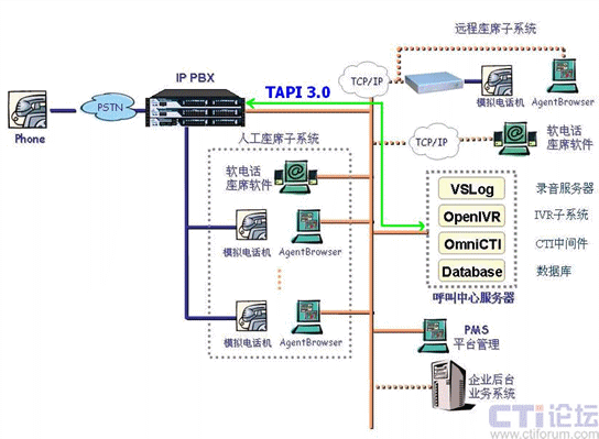 那么如何利用TAPI技術(shù)構(gòu)建現(xiàn)代呼叫中心呢?傳統(tǒng)呼叫中心的做法是每個(gè)坐席配一部電話。而采用TAPI 3.0技術(shù),完全不需要每個(gè)座席再配一部電話,我們只需一臺(tái)電腦終端,配以PC麥克風(fēng)和耳機(jī)即可為客戶服務(wù),因?yàn)楫?dāng)普通電話呼叫轉(zhuǎn)到座席時(shí),語(yǔ)音是經(jīng)過(guò)轉(zhuǎn)換壓縮為IP包進(jìn)行收發(fā)的。我們可以利用TAPI技術(shù)提供的全套API標(biāo)準(zhǔn)函數(shù)來(lái)控制CTI的硬件,包括IPPBX或者板卡,來(lái)實(shí)現(xiàn)這種模式的呼叫中心,并且實(shí)現(xiàn)簡(jiǎn)單,比較適合在原有系統(tǒng)上的升級(jí)換代。