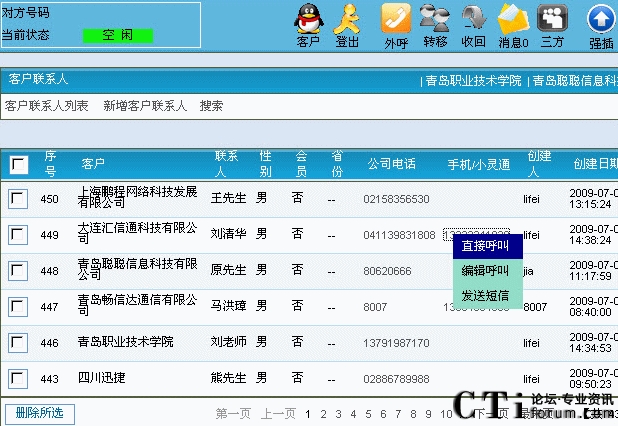 9. 外呼功能:座席人員可以選擇并點擊已有的聯(lián)系人、客戶的電話號碼,系統(tǒng)便自動外呼并接通座席電話,座席人員也可以手工輸入對方號碼,點擊外呼。
