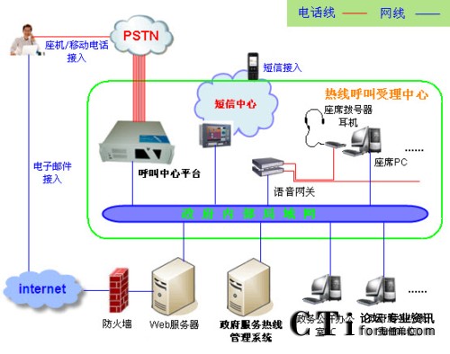- 公民座機(jī)和移動(dòng)電話通過當(dāng)?shù)仉娦诺腜STN網(wǎng)絡(luò)接入呼叫中心平臺(tái),然后進(jìn)入熱線系統(tǒng);