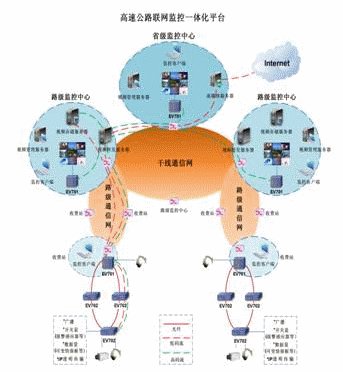 該系統(tǒng)集數(shù)字視頻傳輸、視頻管理、視頻存儲以及外網(wǎng)發(fā)布等功能為一體。 EV701中心設備有4個業(yè)務槽,可任意插拔編解碼卡,最多支持8路視音頻數(shù)據(jù)。采用H.264編碼標準的EV702外場綜合接入設備,將原來外場分散的攝像頭、快球、云臺、可變情報板、報警感應器等設備融為一體,同時也支持MPEG編碼標準的視音頻接入?梢酝瑫r編碼2路以上的視音頻信號,支持雙流傳輸,D1數(shù)據(jù)用于實時觀看,CIF數(shù)據(jù)用于存儲和Web網(wǎng)業(yè)務(包括對外發(fā)布實時圖像和管理人員異地監(jiān)控)。具備IP開關(guān)斷功能,減輕了通信網(wǎng)絡的壓力。 路級中心、區(qū)域中心、省級中心分布式多級監(jiān)控,由省中心統(tǒng)一設定權(quán)限,進行集中管理。