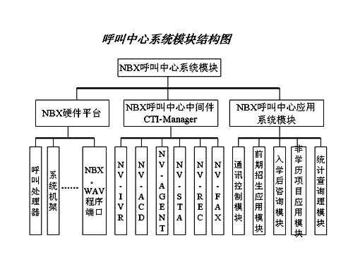 。。此呼叫中心系統(tǒng)主要由三大部分組成:美國3COM公司的NBX產(chǎn)品為系統(tǒng)平臺,及其配套的中間件產(chǎn)品CTI-Manager和上層第三方訂制的教育行業(yè)應(yīng)用軟件。根據(jù)需求,應(yīng)用軟件由五個功能模塊組成:通訊控制模塊、前期招生應(yīng)用模塊、入學(xué)后咨詢應(yīng)用模塊、非學(xué)歷項(xiàng)目應(yīng)用模塊、統(tǒng)計查詢模塊。系統(tǒng)模塊結(jié)構(gòu)圖如下: