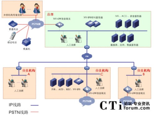 總部部署呼叫中心,NV-IPS呼叫中心平臺采用純IP部署方式,可根據(jù)用戶的實(shí)際環(huán)境,靈活部署,各設(shè)備模塊不受地理位置的限制,降低整體平臺的部署成本。