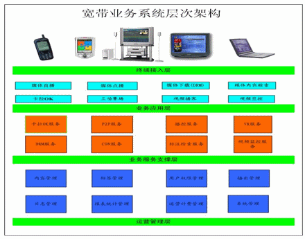 提供多種寬帶業(yè)務產品包,如網絡卡拉OK業(yè)務,持網絡視頻播客業(yè)務,網絡視寬頻視野業(yè)務,也可根據用戶需求定制拓展業(yè)務如遠程教學業(yè)務,網絡音像發(fā)行出版業(yè)務(數字版權保護),網絡電視臺業(yè)務,多媒體辦公業(yè)務等。