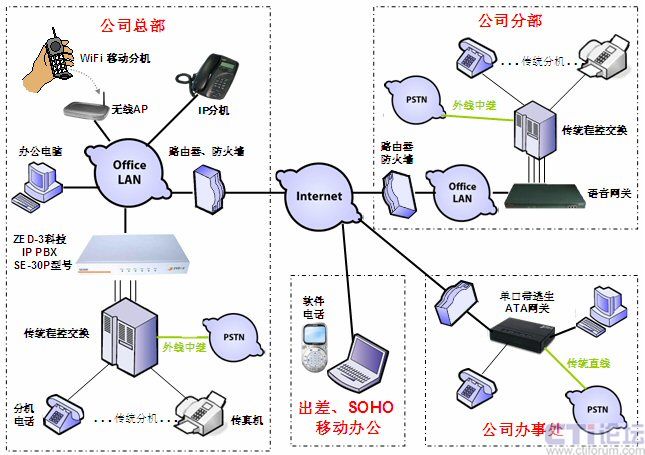 采用SE30系列的IP語(yǔ)音媒體交換機(jī)搭建辦公語(yǔ)音通信平臺(tái),簡(jiǎn)化了原先繁雜的語(yǔ)音通信系統(tǒng),可以輕而易舉地集成到用戶現(xiàn)有的網(wǎng)絡(luò)中,節(jié)省了大量的網(wǎng)絡(luò)改造成本及通訊費(fèi)用。部署快捷、管理方便、功能強(qiáng)大、應(yīng)用靈活、降低成本等優(yōu)勢(shì)明顯;特別適用于出差、家庭辦公、移動(dòng)辦公頻繁的現(xiàn)代中小型企業(yè)用戶,極容易實(shí)現(xiàn)多點(diǎn)異地VoIP組網(wǎng)應(yīng)用。