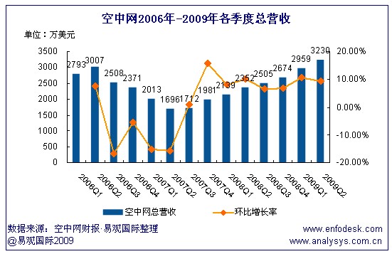 空中網(wǎng)發(fā)布了截至6月30日的2009年第2季度未經(jīng)審計財報。報告顯示,空中網(wǎng)第2季度總營收為3230萬美元,同比增長37%,比上一季度增長9%;按照美國通用會計準則,空中網(wǎng)第2季度凈利潤為355萬美元,高于同年第1季度103萬美元。