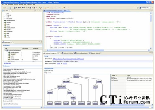 這里強(qiáng)調(diào)的Eclipse插件,除了本身作為優(yōu)秀工具,還提供了附加于Eclipse工作臺(tái)內(nèi)的順暢互操作性:你可以一邊看著對(duì)應(yīng)呼叫者輸入的對(duì)話流程,一邊檢查和完成語(yǔ)音識(shí)別語(yǔ)法;你也可以一邊構(gòu)建連接后臺(tái)的Web服務(wù)代碼,一邊通過(guò)簡(jiǎn)單地拖放來(lái)調(diào)整應(yīng)用邏輯。開(kāi)發(fā)者首次擁有了對(duì)所有應(yīng)用方面的同時(shí)控制,無(wú)須在不同IDE之間進(jìn)行切換,或者在選擇單一環(huán)境時(shí)在特性上的折衷。