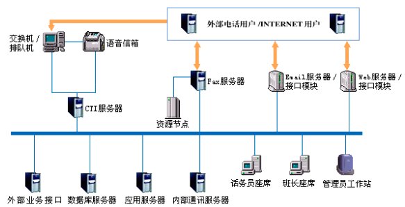 從技術角度上說,呼叫中心系統(tǒng)由三部分組成:交換層、業(yè)務支撐層和業(yè)務層。