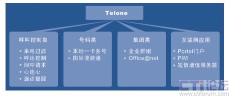 作為智能網(wǎng),Telone平臺可對外提供PPS(預(yù)付費(fèi)業(yè)務(wù))、移動群組(M800)、被叫付費(fèi)(800)、來話過濾等業(yè)務(wù)、國際漫游通。