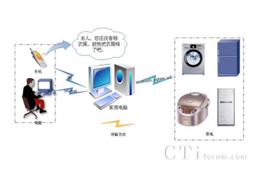 家電遠(yuǎn)控系統(tǒng)的原理是利用電腦或者手機(jī)的電源管理系統(tǒng),來管理用戶終端軟件管理電源的開關(guān)、定時(shí)、預(yù)設(shè)時(shí)間等,利用互聯(lián)網(wǎng)或者手機(jī)網(wǎng)絡(luò)把信號傳輸?shù)郊彝ル娔X,家庭電腦當(dāng)作小型服務(wù)器或者信號轉(zhuǎn)發(fā)點(diǎn),把信號利用藍(lán)牙、zigbee、wifi等無線傳輸?shù)街付ǖ碾娫床遄?dāng)然每個(gè)電源插座都要有相應(yīng)的信號接收模塊實(shí)現(xiàn)和家庭電腦的信號傳輸,實(shí)現(xiàn)了對電源的管理功能。家電遠(yuǎn)控終端軟件嵌入語音合成軟件,利用合成語音報(bào)讀預(yù)設(shè)的提醒內(nèi)容和時(shí)間提醒,具有危急情況下的報(bào)警功能。當(dāng)然如果我們是在家里,可以直接用手機(jī)通過藍(lán)牙對電源插座進(jìn)行管理,或者通過家庭電腦進(jìn)行管理。如圖所示:
