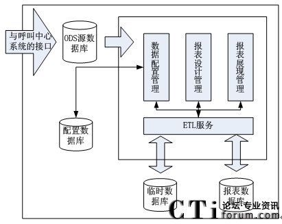 以上架構圖中的呼叫中心是指呼叫中心系統(tǒng)的基礎話務功能部件,它是整個報表系統(tǒng)的基礎,為其提供最初的數(shù)據(jù)來源,包括其基礎部件的通訊等。