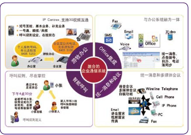 諾基亞西門子通信綜合企業(yè)通信平臺(tái),針對網(wǎng)絡(luò)未來發(fā)展及企業(yè)用戶對下一代語音和融合多媒體業(yè)務(wù)的需求,提出了專業(yè)的企業(yè)通信整體解決方案。該方案可以通過靈活的功能組合幫助運(yùn)營商實(shí)現(xiàn)一體化業(yè)務(wù)提供,為企業(yè)和用戶提供良好的統(tǒng)一使用體驗(yàn),并實(shí)現(xiàn)自我管理。方案集成了豐富的企業(yè)通信和辦公系統(tǒng)的功能,如商務(wù)群業(yè)務(wù)IPCentrex、視頻、托管辦公、會(huì)議、即時(shí)消息、多媒體協(xié)同等。利用該方案運(yùn)營商可以根據(jù)用戶需求實(shí)現(xiàn)快速部署,無縫地融合現(xiàn)有網(wǎng)絡(luò),實(shí)現(xiàn)現(xiàn)有系統(tǒng)向FMC/IMS系統(tǒng)的平滑過渡。