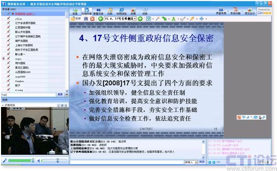 CTI論壇(ctiforum)05月07日消息: 4月8日-9日國(guó)家稅務(wù)總局組織全國(guó)省國(guó)稅地稅局IT主任與解放軍總參三院、中國(guó)信息安全評(píng)測(cè)中心、神州網(wǎng)御70多人在濟(jì)南錦繡山莊以及全國(guó)各地國(guó)稅地稅相關(guān)人員200多人使用自己辦公室的電腦通過(guò)盛維(Cenwave)新世紀(jì)提供的網(wǎng)絡(luò)視頻直播系統(tǒng)召開(kāi)“國(guó)家稅務(wù)系統(tǒng)信息安全風(fēng)險(xiǎn)評(píng)估啟動(dòng)會(huì)”。此次會(huì)議是國(guó)家稅務(wù)總局首次租用網(wǎng)絡(luò)視頻會(huì)議直播系統(tǒng)召開(kāi)全國(guó)性會(huì)議也是參會(huì)人數(shù)最多的一次,不僅打破地點(diǎn)人數(shù)的限制、克服了硬件設(shè)備的局限、節(jié)省行政成本,也是建設(shè)“兩型社會(huì)”的具體體現(xiàn)。
