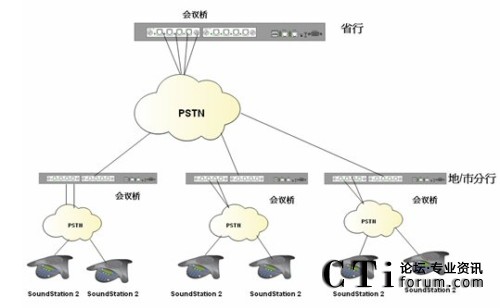 根據(jù)客戶需要在降低會(huì)議成本的前提下實(shí)現(xiàn)快速、便捷、實(shí)時(shí)的多點(diǎn)之間多人會(huì)議溝通的需求,我們制定了以下解決方案;系統(tǒng)利用傳統(tǒng)電話網(wǎng)絡(luò),是客戶擁有自己的會(huì)議管理系統(tǒng);省行方面使用Polycom SS2基本型商務(wù)會(huì)議電話或普通模擬電話;各個(gè)市/縣級(jí)分行,根據(jù)自己會(huì)場(chǎng)的情況自選設(shè)備。