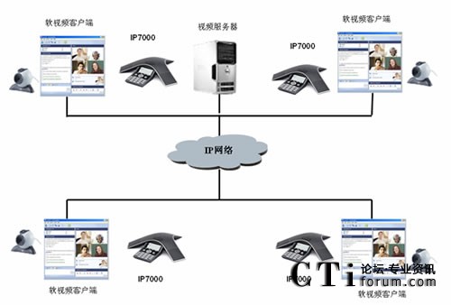 用戶現(xiàn)階段采用V2軟件視頻會議系統(tǒng),但現(xiàn)有的設(shè)備無法解決大型會議室的聲音處理問題。故新增PolycomSoundStation IP 7000音頻會議終端,并通過Polycom專有的計算機(jī)呼叫工具包使其與PC機(jī)相連,解決V2的軟件視頻會議系統(tǒng)大型會議室的聲音處理問題。