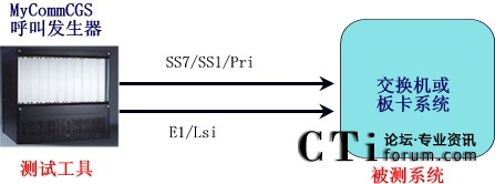 直接將MyCommCGS呼叫發(fā)生器與被測系統(tǒng)對接直連,連接電纜可以采用數(shù)字中繼或者模擬線路,信令支持中國7號、中國1號或者ISDN