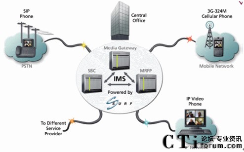 下圖顯示了 Surf 的統(tǒng)一通信平臺如何融合PSTN、 3G(3.5G)移動(dòng)網(wǎng) 和 IP 這三種網(wǎng)絡(luò)。