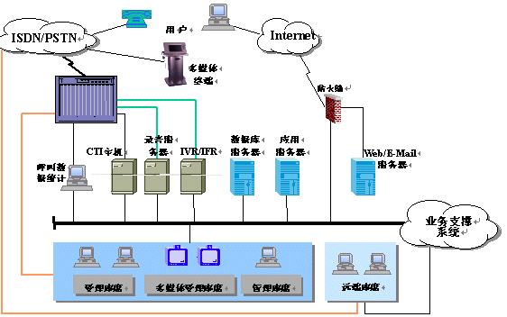 系統(tǒng)主要組成部分有呼叫匯接平臺(tái)、語(yǔ)音/傳真服務(wù)平臺(tái)、座席應(yīng)用平臺(tái)、Internet服務(wù)平臺(tái)、數(shù)據(jù)支撐平臺(tái)、網(wǎng)絡(luò)支撐平臺(tái)。