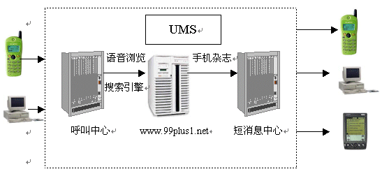 “99+1”統(tǒng)一消息網(wǎng)(以下簡稱“99+1”)是基于統(tǒng)一消息服務(UMS)平臺,應用呼叫中心服務方式,針對移動用戶,以“99+1”網(wǎng)站為中心服務渠道,融合了先進的語音合成和語音識別技術,充分實現(xiàn)了話音、數(shù)據(jù)、短消息等全方位服務方式的綜合信息服務網(wǎng)絡。