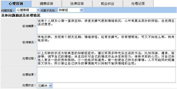 對(duì)于每次咨詢的受理以及答復(fù)記錄,是青少年咨詢平臺(tái)的重要組成部分。針對(duì)青少年的心理特點(diǎn)咨詢問題的類別,專門開發(fā)“12355”青少年服務(wù)臺(tái)業(yè)務(wù)受理系統(tǒng)。通過對(duì)來訪者的資料的登記,以及對(duì)咨詢服務(wù)的詳細(xì)記錄和電話錄音,今后可方便的查詢服務(wù)臺(tái)的的咨詢情況,并能有效的跟蹤處理,青少年遇到的心里、求學(xué)、婚姻和法律維權(quán)等方面的訴求。并能快速準(zhǔn)確的統(tǒng)計(jì)服務(wù)臺(tái)的各項(xiàng)服務(wù)的數(shù)據(jù)。