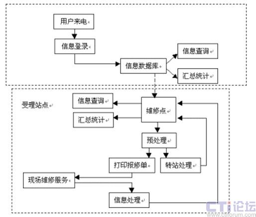 維修點對用戶的報修情況進行預處理之后,根據(jù)用戶所在的區(qū)域,分配至最近距離的維修站,將用戶與其報修信息即時轉移,這也就是圖中所顯示的"轉站處理"。之后,維修站將直接打印出報修單,加快服務實施的效率、減少人工出錯的比例,有專業(yè)人員及時上門服務檢修。