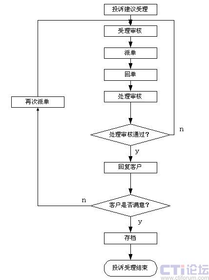 話務(wù)員確認投訴和建議后由復(fù)審員再次確認分析,然后把用戶的各種意見和合理化建議轉(zhuǎn)相關(guān)部門處理,對呼叫中心本身的投訴則轉(zhuǎn)班長席處理。投訴受理系統(tǒng)可以設(shè)置處理部門和處理時限,完成告警輸出和各種統(tǒng)計分析工作,投訴和建議的處理結(jié)果可以根據(jù)需要采用人工、自動、傳真、短信的形式反饋到用戶以提高用戶對服務(wù)的滿意度。