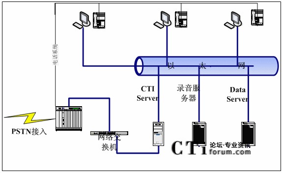 消費(fèi)者撥打訂購電話,經(jīng)PSTN接入到呼叫中心交換機(jī),由CTI服務(wù)器(CTI Server)通過交換機(jī)將話務(wù)分配到相應(yīng)空閑坐席。坐席端記錄訂購信息及消費(fèi)者信息,并將信息存入數(shù)據(jù)服務(wù)器(DataServer)。交換機(jī)對通話進(jìn)行全程錄音,并存入錄音服務(wù)器。同時可把進(jìn)入系統(tǒng),但未排隊到坐席的話務(wù)數(shù)據(jù)記錄存入數(shù)據(jù)庫服務(wù)器,以便回訪。