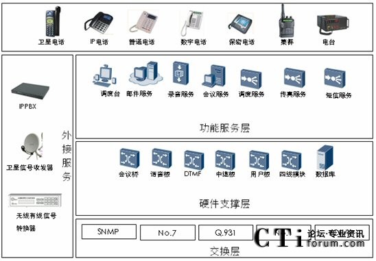 C網(wǎng)、G網(wǎng)、3G、PSTN網(wǎng)、VOIP網(wǎng)、衛(wèi)星電話(huà)、數(shù)字集群系統(tǒng)及短波電臺(tái)、超短波電臺(tái)及各頻段對(duì)講機(jī)等無(wú)線(xiàn)設(shè)備互聯(lián)互通。
